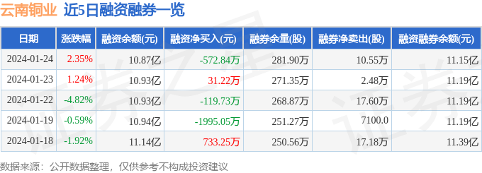 云南铜业融资融券信息显示,融资方面,当日融资买入1947.91万元,融资偿还2520.75万元,融资净偿还572.84万元。融券方面,融券卖出13.86万股,融券偿还3.31万股,融券余量281.9万股,融券余额2827.43万元。融资融券余额11.15亿元。近5日融资融券数据一览见下表: