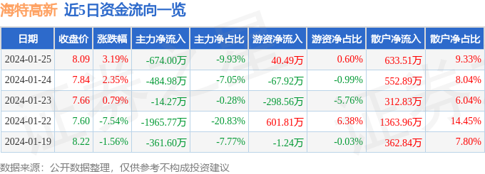 股票行情快报:海特高新(002023)1月24日主力资金净卖出484.98万元