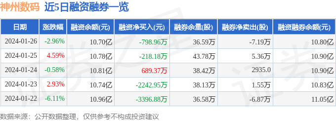 神州数码融资融券信息显示,融资方面,当日融资买入4955.5万元,融资偿还5754.46万元,融资净偿还798.96万元。融券方面,融券卖出15.12万股,融券偿还22.31万股,融券余量36.59万股,融券余额946.51万元。融资融券余额10.8亿元。近5日融资融券数据一览见下表: