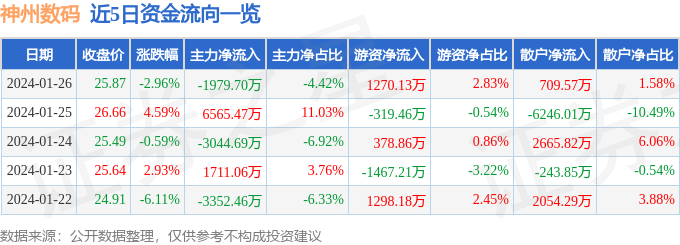神州数码(000034)1月26日主力资金净卖出1979.70万元