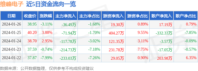 维峰电子(301328)1月26日主力资金净卖出36.49万元