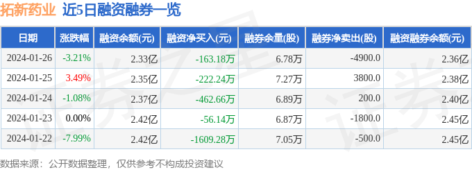 拓新药业融资融券信息显示,融资方面,当日融资买入970.27万元,融资偿还1133.46万元,融资净偿还163.18万元。融券方面,融券卖出1200.0股,融券偿还6100.0股,融券余量6.78万股,融券余额311.07万元。融资融券余额2.36亿元。近5日融资融券数据一览见下表: