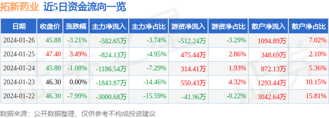 拓新药业(301089)1月26日主力资金净卖出582.65万元