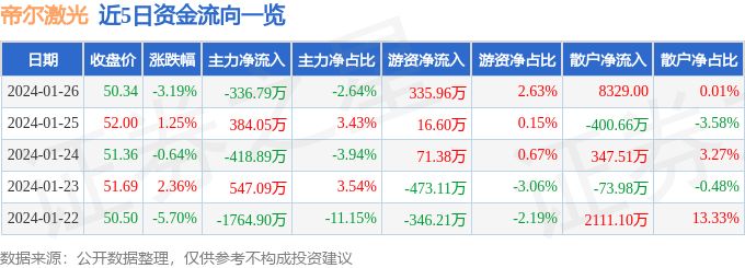 帝尔激光(300776)1月26日主力资金净卖出336.79万元