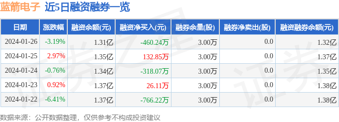 蓝箭电子融资融券信息显示,融资方面,当日融资买入528.1万元,融资偿还988.35万元,融资净偿还460.24万元。融券方面,融券卖出0.0股,融券偿还0.0股,融券余量3.0万股,融券余额113.64万元。融资融券余额1.32亿元。近5日融资融券数据一览见下表: