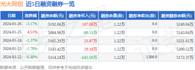 光大同创融资融券信息显示,融资方面,当日融资买入328.33万元,融资偿还221.25万元,融资净买入107.08万元。融券方面,融券卖出0.0股,融券偿还0.0股,融券余量1.22万股,融券余额56.99万元。融资融券余额5249.04万元。近5日融资融券数据一览见下表: