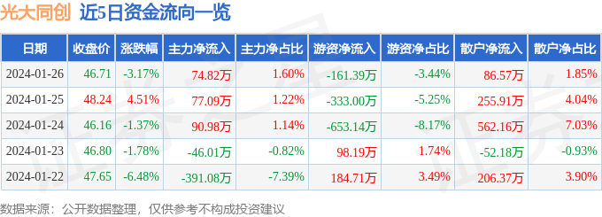 财经消息,截至2024年1月26日收盘,光大同创(301387)报收于46.71元,下跌3.17%,换手率5.63%,成交量9912.0手,成交额4688.23万元。