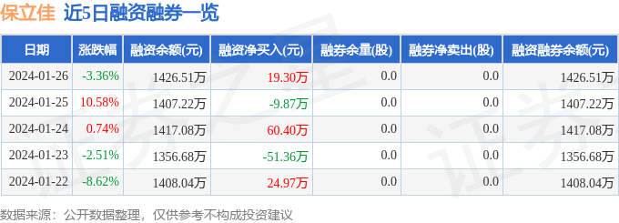 保立佳融资融券信息显示,融资方面,当日融资买入121.33万元,融资偿还102.04万元,融资净买入19.3万元。融券方面,融券卖出0.0股,融券偿还0.0股,融券余量0.0股,融券余额0.0万元。融资融券余额1426.51万元。近5日融资融券数据一览见下表: