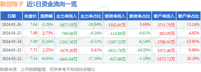 联创电子(002036)1月26日主力资金净卖出3877.59万元
