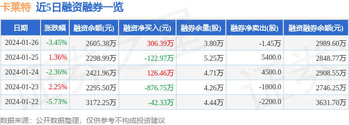 卡莱特融资融券信息显示,融资方面,当日融资买入577.54万元,融资偿还271.15万元,融资净买入306.39万元。融券方面,融券卖出8300.0股,融券偿还2.28万股,融券余量3.8万股,融券余额384.22万元。融资融券余额2989.6万元。近5日融资融券数据一览见下表: