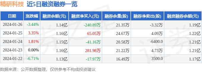 精研科技融资融券信息显示,融资方面,当日融资买入481.85万元,融资偿还722.73万元,融资净偿还240.89万元。融券方面,融券卖出3.79万股,融券偿还7.11万股,融券余量21.35万股,融券余额540.15万元。融资融券余额1.19亿元。近5日融资融券数据一览见下表: