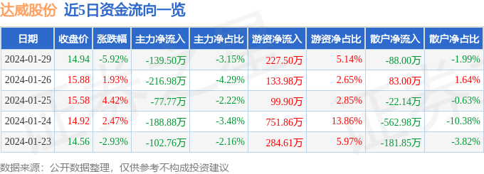 达威股份(300535)1月29日主力资金净卖出139.50万元