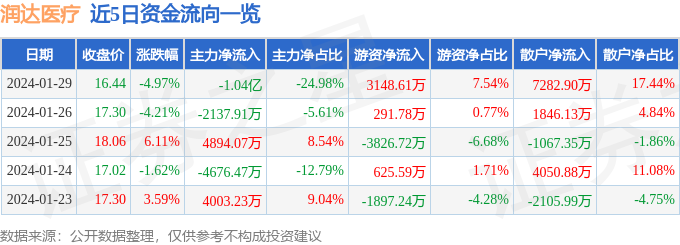 财经消息,截至2024年1月29日收盘,润达医疗(603108)报收于16.44元,下跌4.97%,换手率4.21%,成交量25.15万手,成交额4.18亿元。