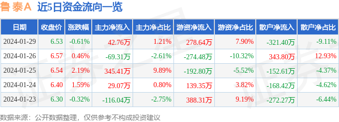 股票行情快报:鲁泰A(000726)1月29日主力资金净买入42.76万元