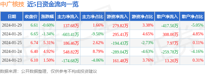 股票行情快报:中广核技(000881)1月29日主力资金净买入137.68万元