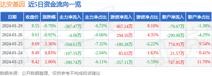 财经消息,截至2024年1月29日收盘,达安基因(002030)报收于8.55元,下跌0.7%,换手率0.48%,成交量6.72万手,成交额5764.04万元。