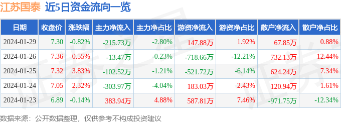 财经消息,截至2024年1月29日收盘,江苏国泰(002091)报收于7.3元,下跌0.82%,换手率0.65%,成交量10.46万手,成交额7717.88万元。