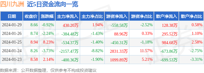财经消息,截至2024年1月29日收盘,四川九洲(000801)报收于8.66元,下跌0.92%,换手率2.47%,成交量25.25万手,成交额2.22亿元。