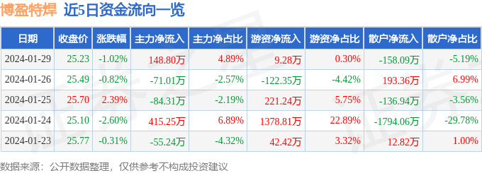 财经消息,截至2024年1月29日收盘,博盈特焊(301468)报收于25.23元,下跌1.02%,换手率3.58%,成交量1.18万手,成交额3045.0万元。