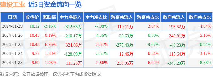 股票行情快报:建设工业(002265)1月29日主力资金净卖出312.63万元