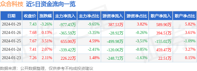 财经消息,截至2024年1月29日收盘,众合科技(000925)报收于7.43元,下跌3.26%,换手率2.45%,成交量13.45万手,成交额1.01亿元。