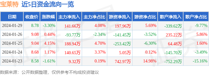 1月29日的资金流向数据方面,主力资金净流入141.66万元,占总成交额4.08%,游资资金净流入197.96万元,占总成交额5.69%,散户资金净流出339.62万元,占总成交额9.77%。