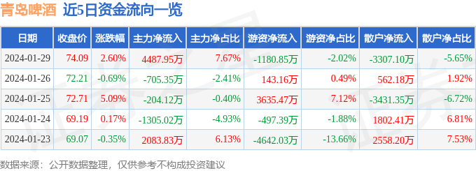 青岛啤酒(600600)1月29日主力资金净买入4487.95万元