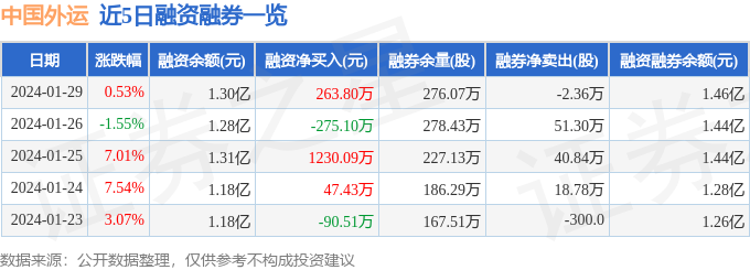 中国外运融资融券信息显示,融资方面,当日融资买入1224.28万元,融资偿还960.48万元,融资净买入263.8万元。融券方面,融券卖出12.16万股,融券偿还14.52万股,融券余量276.07万股,融券余额1584.63万元。融资融券余额1.46亿元。近5日融资融券数据一览见下表: