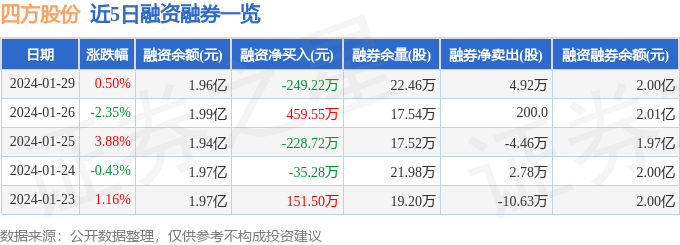 四方股份融资融券信息显示,融资方面,当日融资买入180.27万元,融资偿还429.49万元,融资净偿还249.22万元。融券方面,融券卖出5.81万股,融券偿还8900.0股,融券余量22.46万股,融券余额318.48万元。融资融券余额2.0亿元。近5日融资融券数据一览见下表: