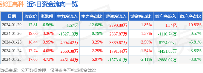 张江高科(600895)1月29日主力资金净卖出1.57亿元