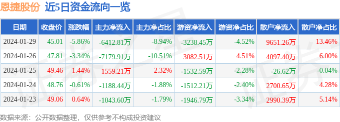 财经消息,截至2024年1月29日收盘,恩捷股份(002812)报收于45.01元,下跌5.86%,换手率1.87%,成交量15.5万手,成交额7.17亿元。