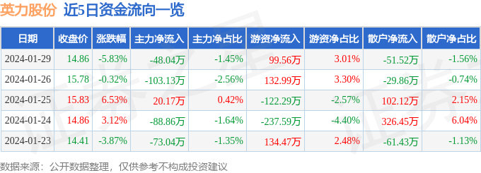 英力股份(300956)1月29日主力资金净卖出48.04万元