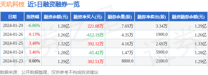 天玑科技融资融券信息显示,融资方面,当日融资买入474.91万元,融资偿还253.83万元,融资净买入221.08万元。融券方面,融券卖出4.48万股,融券偿还1.14万股,融券余量7.69万股,融券余额55.98万元。融资融券余额1.29亿元。近5日融资融券数据一览见下表: