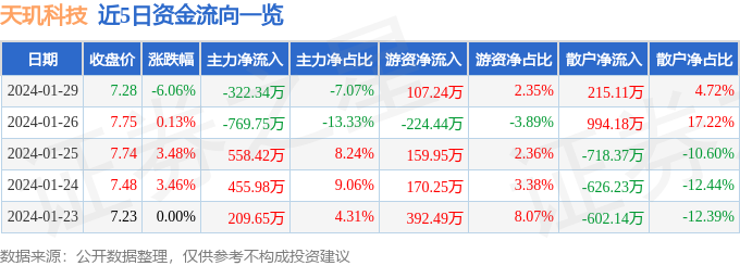 天玑科技(300245)1月29日主力资金净卖出322.34万元