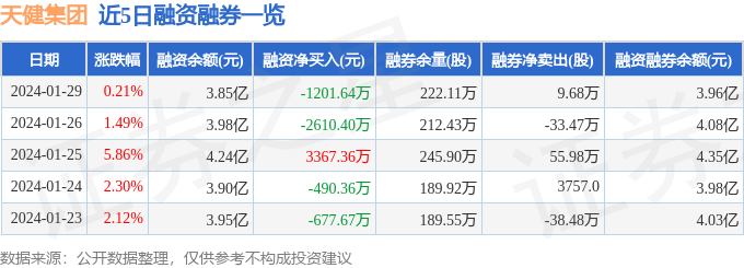 天健集团融资融券信息显示,融资方面,当日融资买入3686.47万元,融资偿还4888.11万元,融资净偿还1201.64万元。融券方面,融券卖出63.71万股,融券偿还54.03万股,融券余量222.11万股,融券余额1061.71万元。融资融券余额3.96亿元。近5日融资融券数据一览见下表: