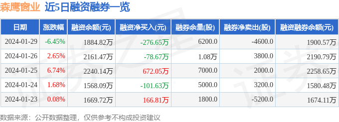 森鹰窗业融资融券信息显示,融资方面,当日融资买入110.46万元,融资偿还387.1万元,融资净偿还276.65万元。融券方面,融券卖出1000.0股,融券偿还5600.0股,融券余量6200.0股,融券余额15.75万元。融资融券余额1900.57万元。近5日融资融券数据一览见下表: