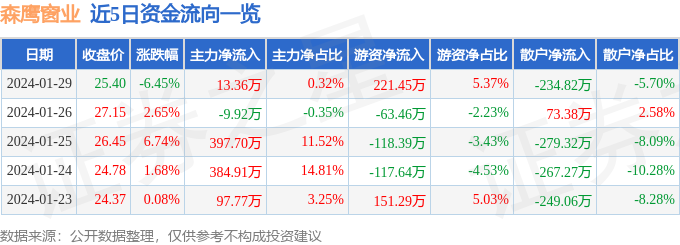 森鹰窗业(301227)1月29日主力资金净买入13.36万元