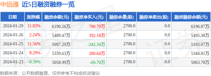 中远通融资融券信息显示,融资方面,当日融资买入4973.58万元,融资偿还4272.8万元,融资净买入700.79万元。融券方面,融券卖出2700.0股,融券偿还2700.0股,融券余量2700.0股,融券余额6.61万元。融资融券余额6196.87万元。近5日融资融券数据一览见下表: