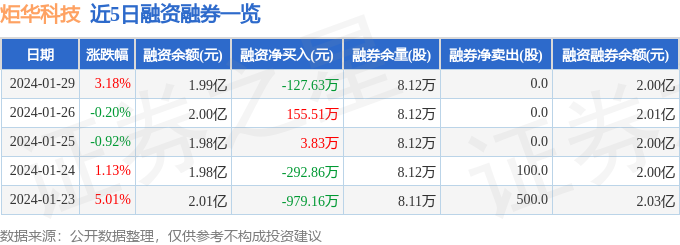 炬华科技融资融券信息显示,融资方面,当日融资买入2064.21万元,融资偿还2191.83万元,融资净偿还127.63万元。融券方面,融券卖出3600.0股,融券偿还3600.0股,融券余量8.12万股,融券余额126.43万元。融资融券余额2.0亿元。近5日融资融券数据一览见下表: