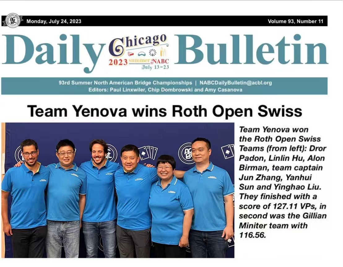 此外,2023年7月,在北美桥牌夏季大赛上,由张钧董事长领衔并作为主力队员的业之峰桥牌队还成功斩获瑞士制团队赛冠军。这是继2018年在夏威夷北美秋季大赛后,业之峰队再次摘得这一桂冠。