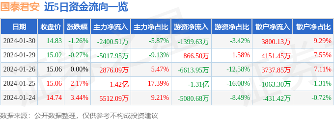 股票行情快报:国泰君安(601211)1月30日主力资金净卖出2400.51万元