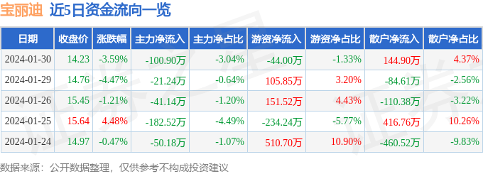 1月30日的资金流向数据方面,主力资金净流出100.9万元,占总成交额3.04%,游资资金净流出44.0万元,占总成交额1.33%,散户资金净流入144.9万元,占总成交额4.37%。