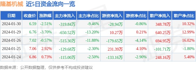 股票行情快报:隆基机械(002363)1月30日主力资金净卖出319.84万元