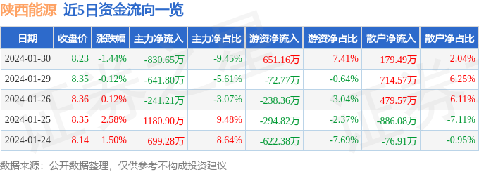 财经消息,截至2024年1月30日收盘,陕西能源(001286)报收于8.23元,下跌1.44%,换手率1.41%,成交量10.58万手,成交额8792.82万元。