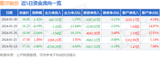 财经消息,截至2024年1月30日收盘,歌尔股份(002241)报收于16.0元,下跌1.42%,换手率1.46%,成交量44.08万手,成交额7.12亿元。