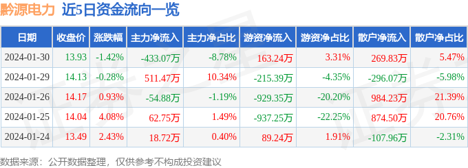股票行情快报:黔源电力(002039)1月30日主力资金净卖出433.07万元