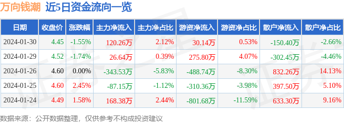 1月30日的资金流向数据方面,主力资金净流入120.26万元,占总成交额2.12%,游资资金净流入30.14万元,占总成交额0.53%,散户资金净流出150.4万元,占总成交额2.66%。