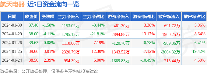1月30日的资金流向数据方面,主力资金净流出1153.02万元,占总成交额8.44%,游资资金净流入461.3万元,占总成交额3.38%,散户资金净流入691.72万元,占总成交额5.06%。