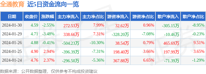 财经消息,截至2024年1月30日收盘,全通教育(300359)报收于4.59元,下跌2.55%,换手率1.16%,成交量7.35万手,成交额3409.66万元。