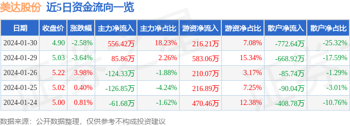 财经消息,截至2024年1月30日收盘,美达股份(000782)报收于4.9元,下跌2.58%,换手率1.17%,成交量6.19万手,成交额3051.97万元。
